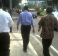 Dahlan dengan berkemeja biru, berjalan di trotoar dengan ditemani dua orang asistennya.